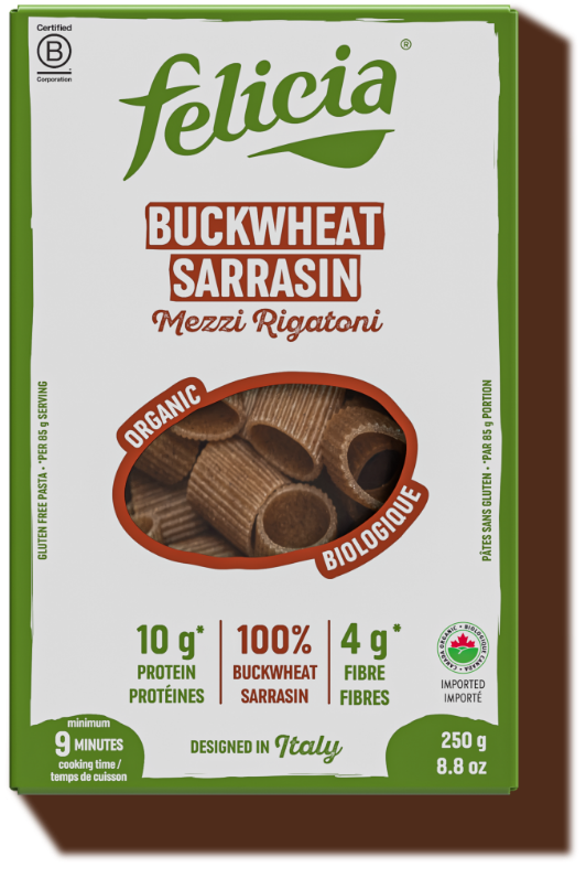 No! It may be wearing a clever disguise, but this is actually a box of the finest organic whole grain buckwheat, in a shape inspired by centuries of tradition and made possible by modern innovation. Buckwheat is a health-boosting superfood, filling these mezzi rigatoni rich in magnesium. Buckwheat is also naturally gluten-free – and it’s never tasted so good.