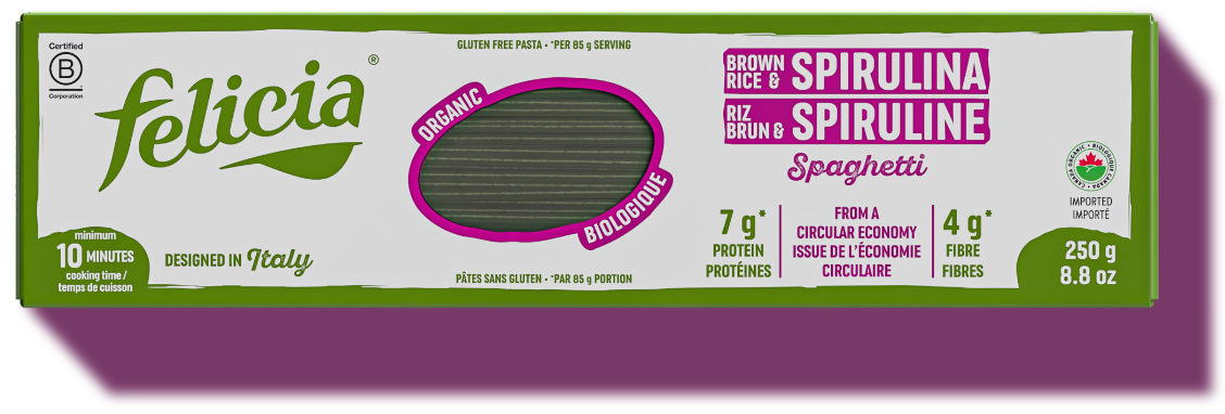 No! Our pasta, made from organic brown rice and 100% Italian-grown spirulina, is a nutritious innovation. Rich in antioxidants and essential amino acids, our spirulina is sustainably grown by our Italian partner Apuliakundi in a circular zero-waste system, using water from our own pasta production process. Spirulina has been called “the food of the future”– and paired with naturally gluten-free brown rice, it’s never tasted so good.